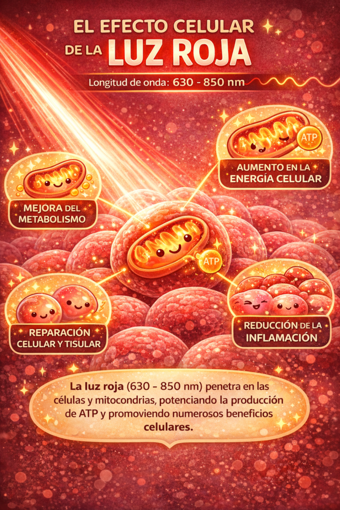 Cuando la luz roja penetra en las capas más profundas de la piel, impacta directamente en las mitocondrias —las centrales de energía celular—, aumentando la producción de ATP (energía celular). Este efecto desencadena una cascada de procesos que pueden: